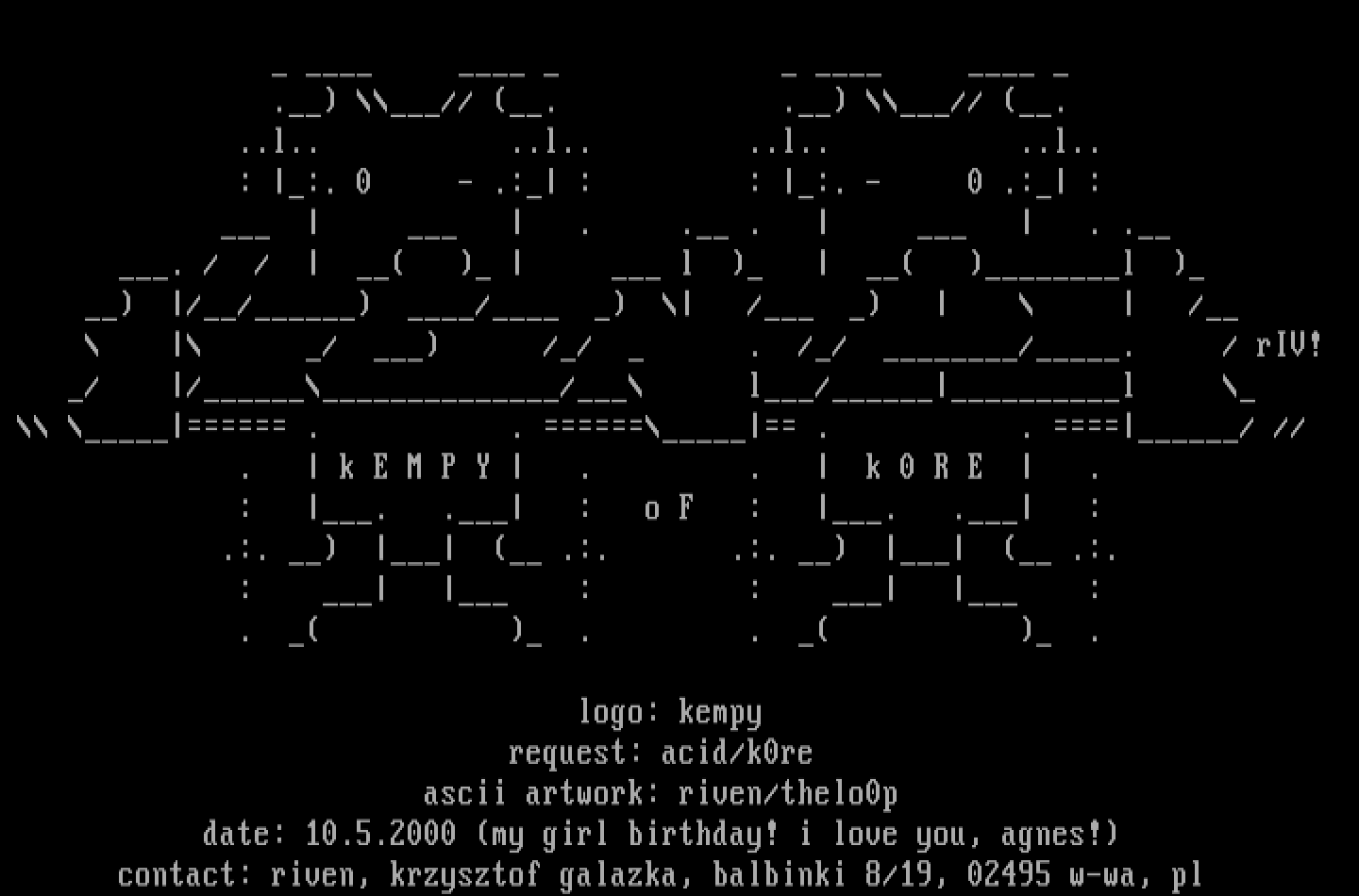 contact: riven, krzysztof galazka, balbinki 8/19, 02495 w-wa, pl