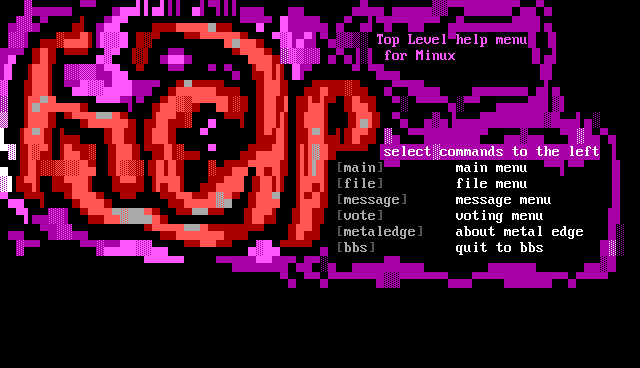 Top Levelhelp menu for Minux selectcommands to the left main main menu file file menu message message menu vote voting menu metaledge about metal edge bbs quit to bbs