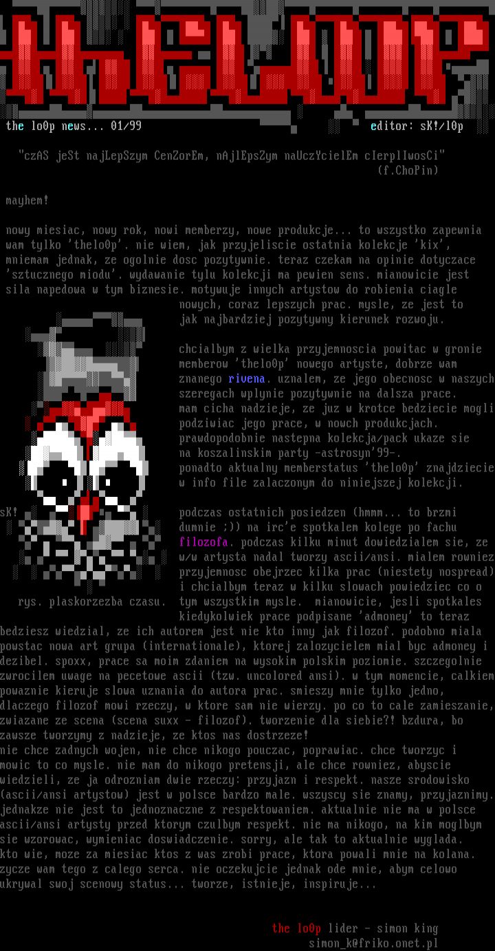 w/w artysta nadal tworzy ascii/ansi. mialem rowniez przyjemnosc obejrzec kilka prac niestety nospread i chcialbym teraz w kilku slowach powiedziec co o