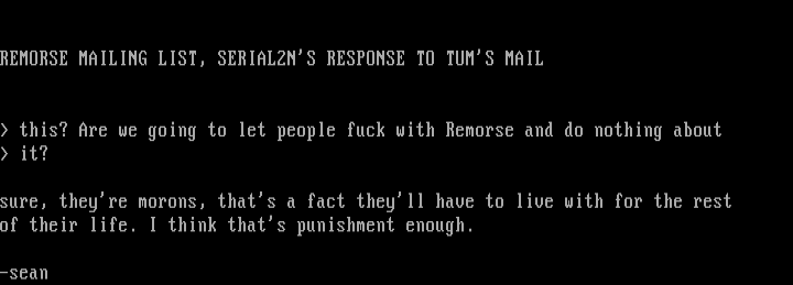 REMORSE MAILING LIST, SERIAL2NS RESPONSE TO TUMS MAIL