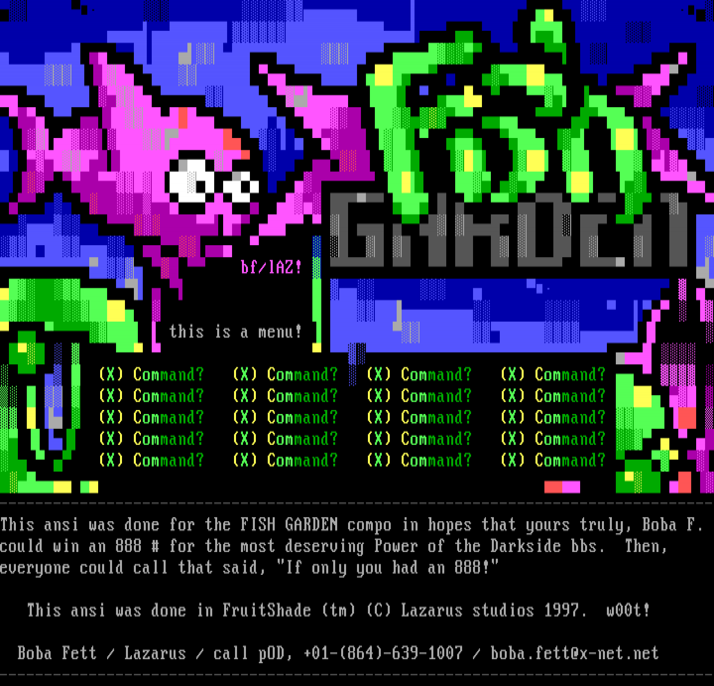 --------------------------------------------------------------------------------This ansi was done for the FISH GARDEN compo in hopes that yours truly, Boba F.