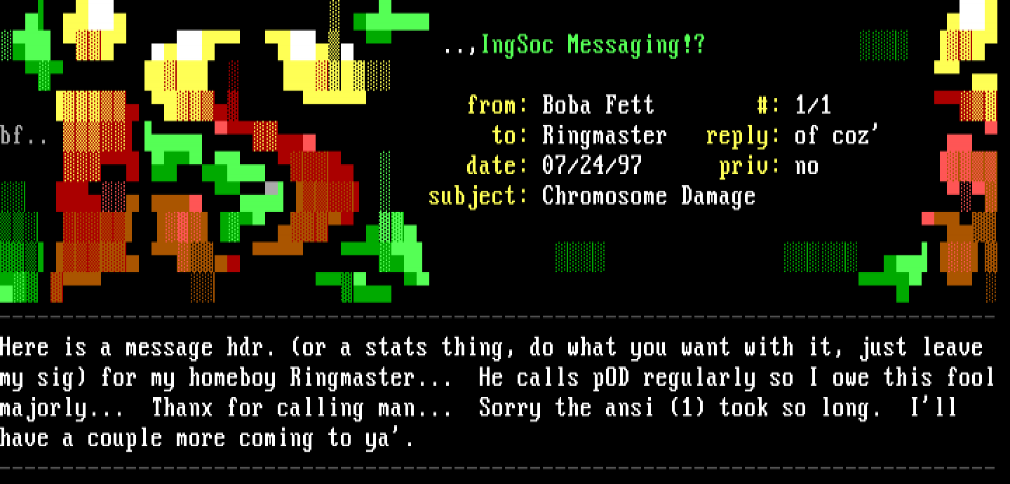 ..,IngSoc Messaging!? from: Boba Fett : 1/1 bf.. to: Ringmaster reply: of coz date: 07/24/97 priv: no subject: Chromosome Damage -------------------------------------------------------------------------------