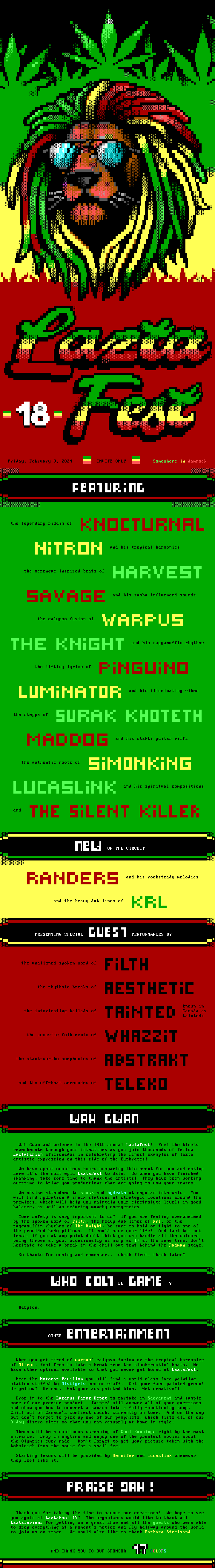 R Wah Gwan and welcome to the 18th annual LaztaFest! Feel the blocks g sreverberate through your intestines as you join thousands of fellowgreen!OLaztafarian aficionados in celebrating the finest examples of lazta artistic expression on this side of the Euphrates!OurSpacedOutPavillionwillbeofferingSacramenttoallthosewillingandWe have spent countless hours preparing this event for you and making lsure its the most epic LaztaFest to date. So when you have finished Cskanking, take some time to thank the artists! They have been working overtime to bring you productions that are going to wow your senses. We advise attendees to snack and hydrate at regular intervals. You will find hydration snack stations at strategic locations around the premises, which will help you maintain your electrolyte levels in good balance, as well as reducing munchy emergencies. Your safety is very important to us! If you are feeling overwhelmed by the spoken wordof Filth, the heavy dub lines of Krl, or the raggamuffin rhythms ofThe Knight, be sure to hold on tight to one of the provided body pillows.It could save your life! And last but not least, if you at any point dont think you can handle all the colours being thrown at you, occasionally as many as 17 at the same time, dont hesitate to take a break in the chill out tent behind the Radman stage. So thanks for coming and remember.. skank first, thank later!