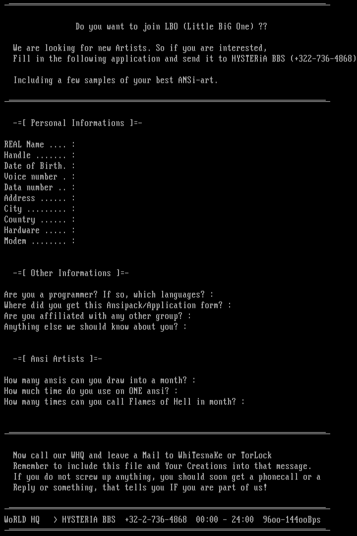 Fill in the following application and send it to HYSTERiA BBS +322-736-4868