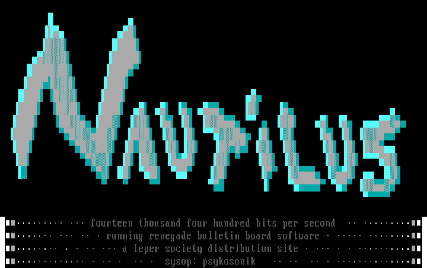 fourteen thousand four hundred bits per second running renegade bulletin board software a leper society distribution site sysop: psykosonik