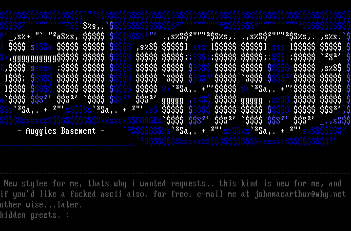 if youd like a fucked ascii also. for free. e-mail me at johnmacarthur@why.net