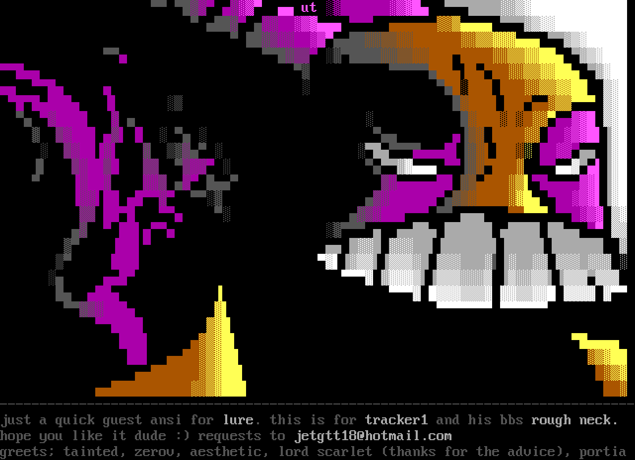 ut --------------------------------------------------------------------------------just a quick guest ansi for lure. this is for tracker1 and his bbs rough neck.