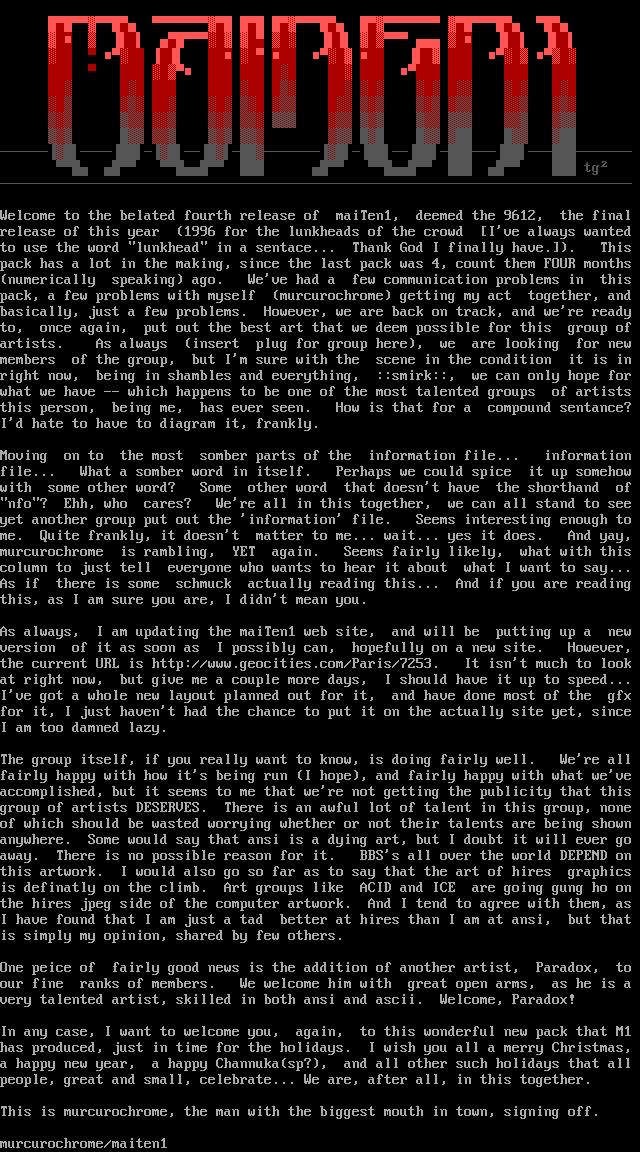 Welcome to the belated fourth release of maiTen1, deemed the 9612, the final release of this year 1996 for the lunkheads of the crowd Ive always wanted