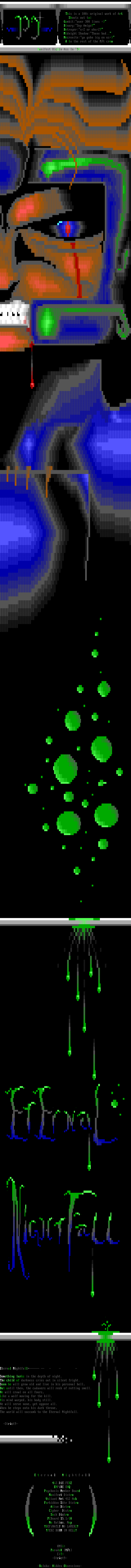 This is a 100 original work of Art Shouts out to: Gambit:over 300 lines Binary:Sup Amigo? Betrayer:v/2 or obv/2? Midnight Shadow:Thanx bud.. Necronite:ya gohn icy on us to the rest of the Mt crew Manifest Kickin Ass In 94