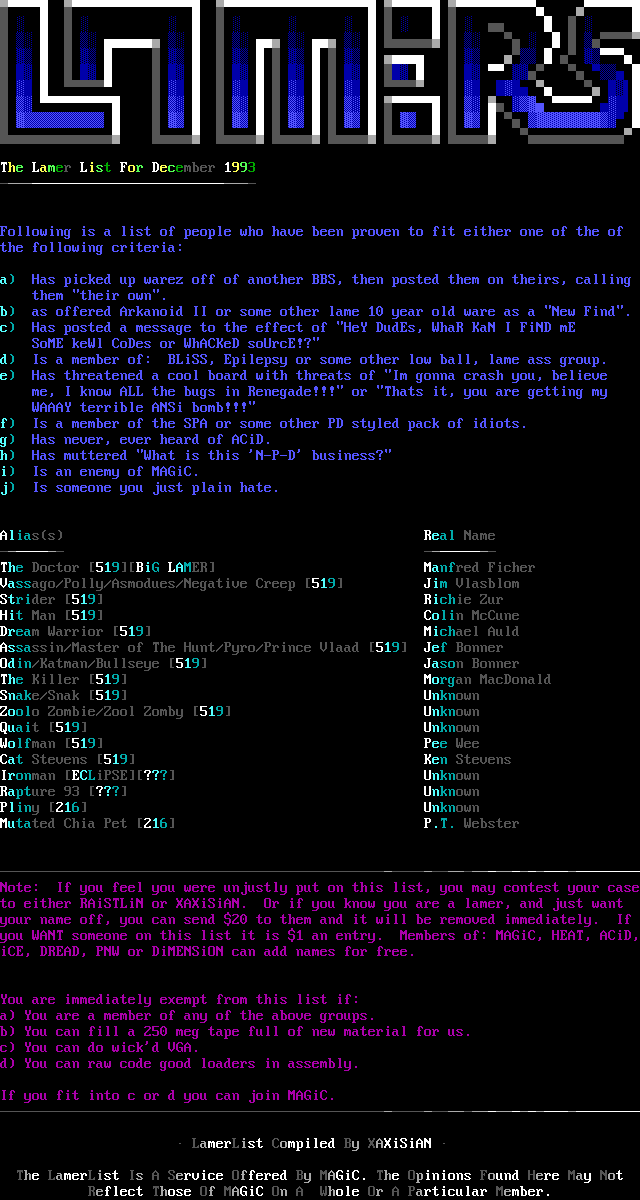you WANT someone on this list it is 1 an entry. Members of: MAGiC, HEAT, ACiD,iCE, DREAD, PNW or DiMENSiON can add names for free.