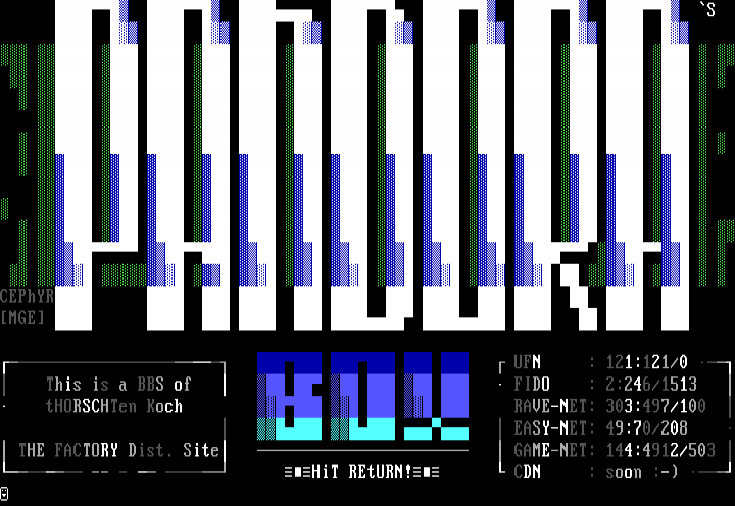 UFN : 121:121/0 This is a BBS of FIDO : 2:246/1513 tHORSCHTen Koch RAVE-NET: 303:497/100 EASY-NET: 49:70/208 THE FACTORY Dist. Site GAME-NET: 144:4912/503 -- - HiT REtURN! CDN : soon :-