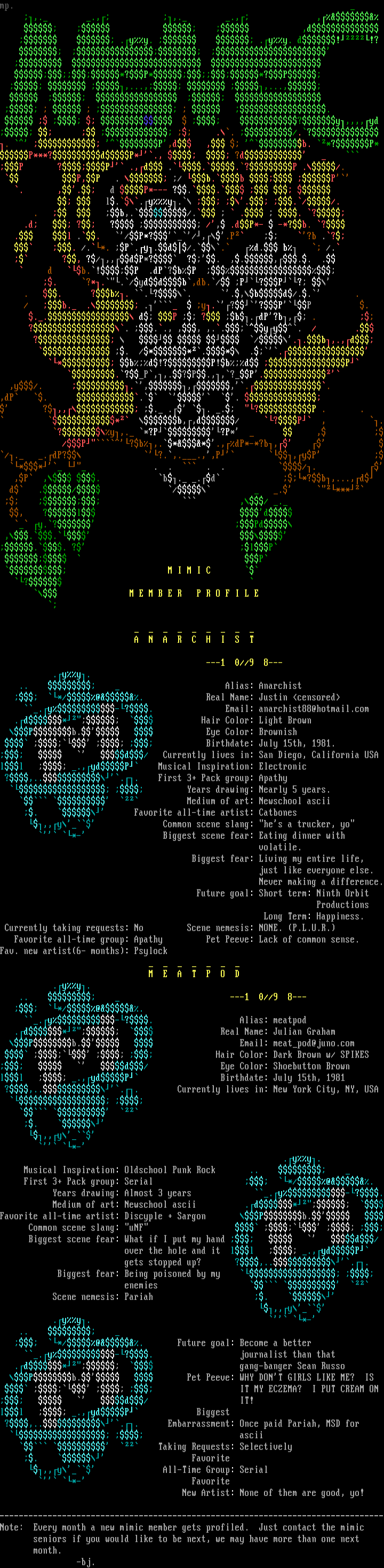 Years drawing: Almost 3 years .y-?. Medium of art: Newschool ascii .d* Favorite all-time artist: Discyple + Sargon Pb. Common scene slang: uNF Biggest scene fear: What if I put my hand d/ over the hole and it ll .,ydP