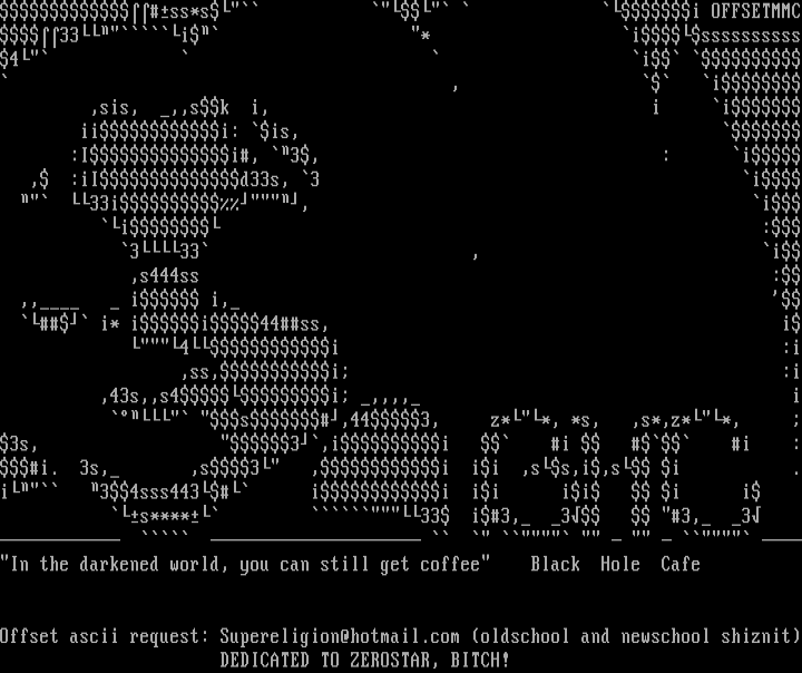 Offset ascii request: Supereligion@hotmail.com oldschool and newschool shiznit DEDICATED TO ZEROSTAR, BITCH!