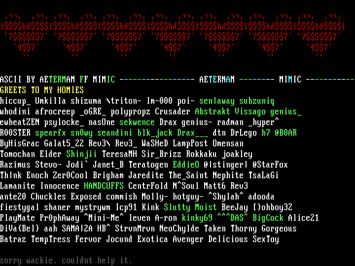ASCII BY AETERMAM FF MIMIC ----------------- AETERNAM -------- MIMIC -----------GREETS TO MY HOMIES