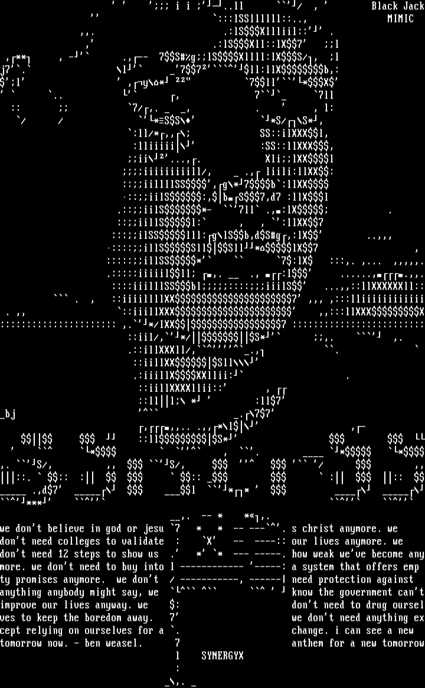 we dont believe in god or jesu 7 * * -- ---. s christ anymore. we dont need colleges to validate : X -- ----:: our lives anymore. we dont need 12 steps to show us . * * --- -----. how weak weve become anymore. we dont need to buy into l ------------ -----: a system that offers emp ty promises anymore. we dont / -----------, ------ need protection against