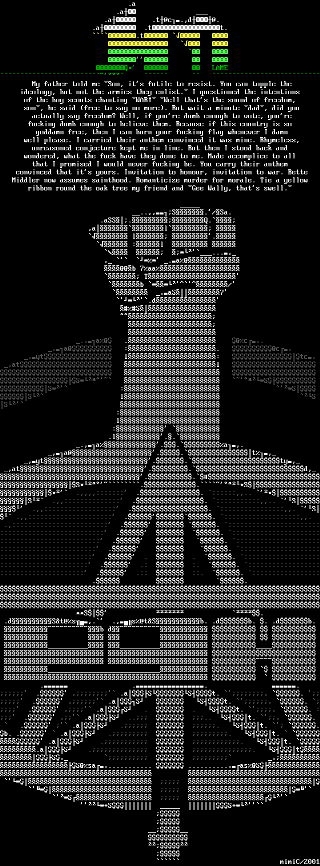 My father told me Son, its futile to resist. You can topple the ideology, but not the armies they enlist. I questioned the intentions of the boy scouts chanting WAR! Well thats the sound of freedom, son, he said free to say no more. But wait a minute dad, did you actually say freedom? Well, if youre dumb enough to vote, youre fucking dumb enough to believe them. Because if this country is so goddamn free, then I can burn your fucking flag whenever I damn well please. I carried their anthem convinced it was mine. Rhymeless, unreasoned conjecture kept me in line. But then I stood back and