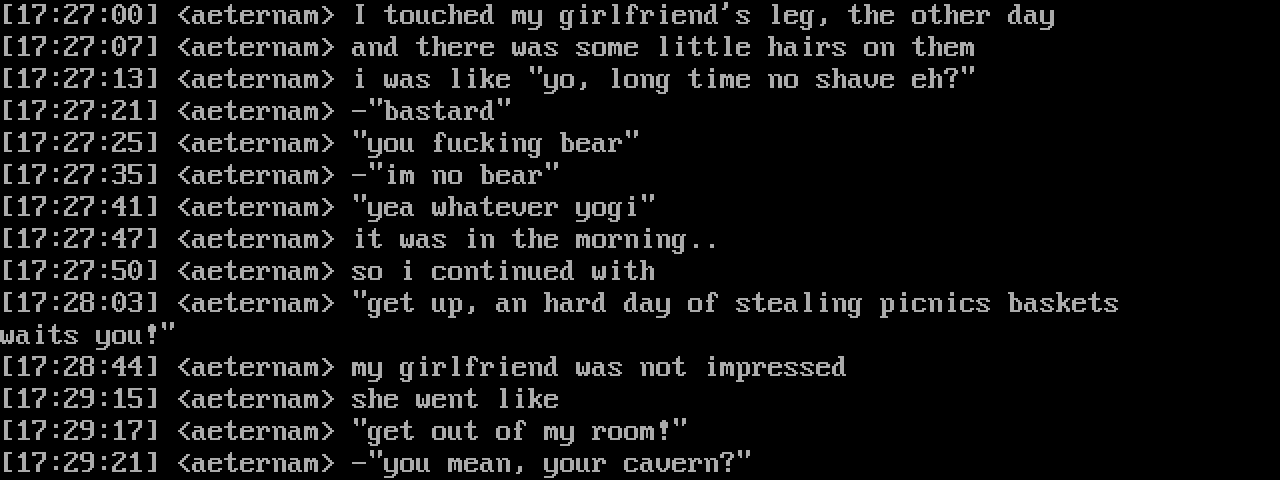 17:27:00 aeternam I touched my girlfriends leg, the other day