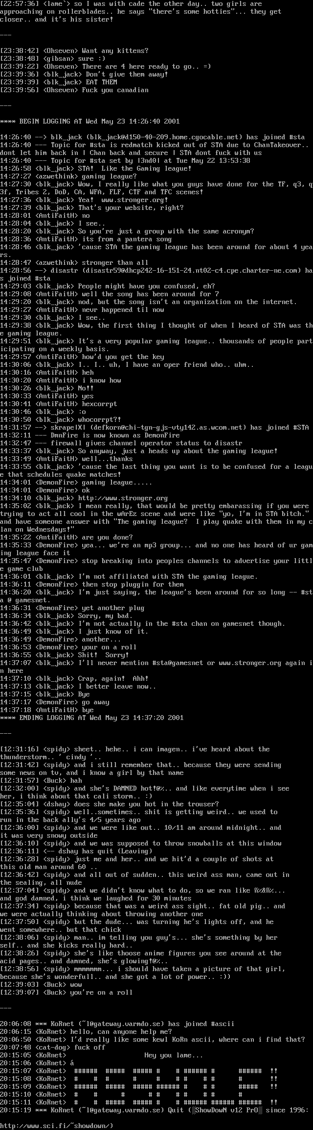 14:35:02 blkjack I mean really, that would be pretty embarassing if you were trying to act all cool in the wArEz scene and were like yo, Im in STA bitch. and have someone answer with The gaming league? I play quake with them in my clan on Wednesdays!