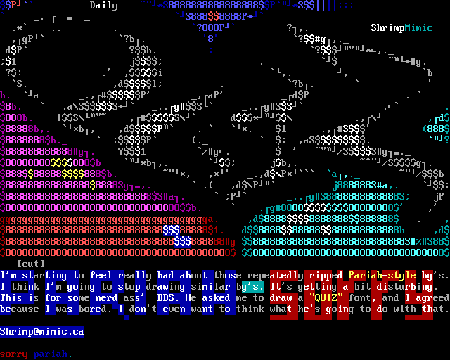 This is for some nerd ass BBS. He asked me to draw a QUIZ font, and I agreedbecause I was bored.I dont even want to think what hes going to do with that.