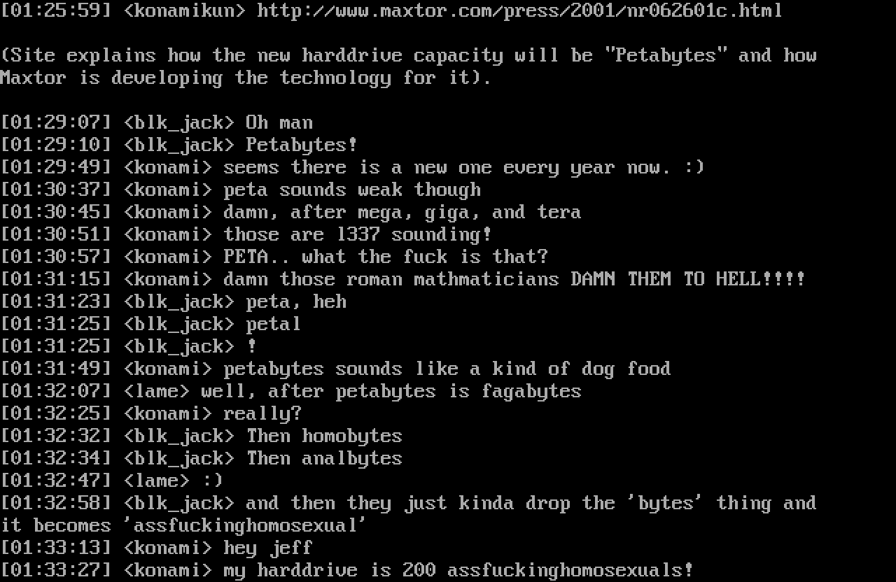 01:33:27 konami my harddrive is 200 assfuckinghomosexuals!