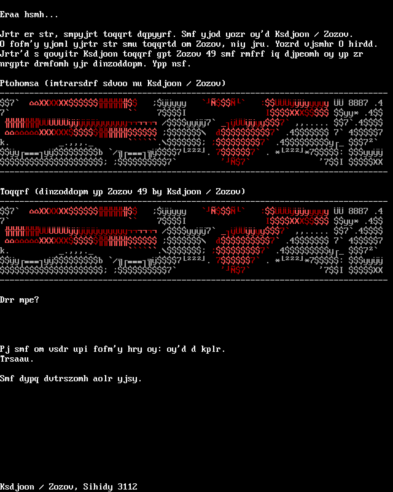 O fofmy yjoml yjrtr str smu toqqrtd om Zozov, niy jru. Yozrd vjsmhr O hirdd.