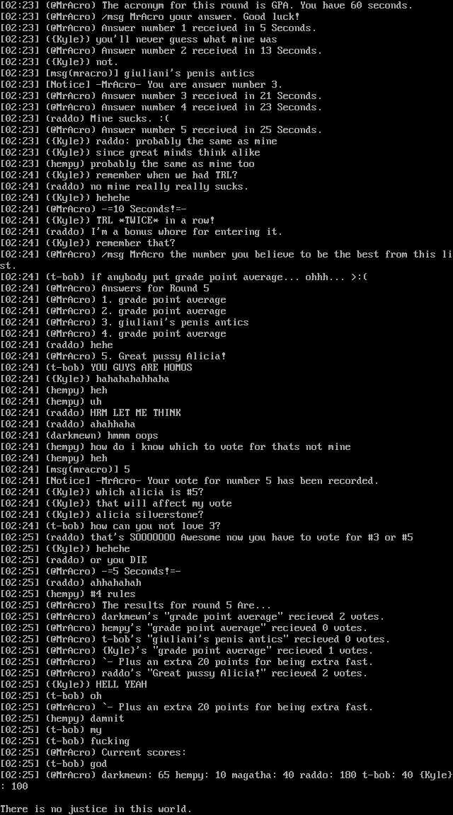 02:25 @MrAcro t-bobs giulianis penis antics recieved 0 votes.