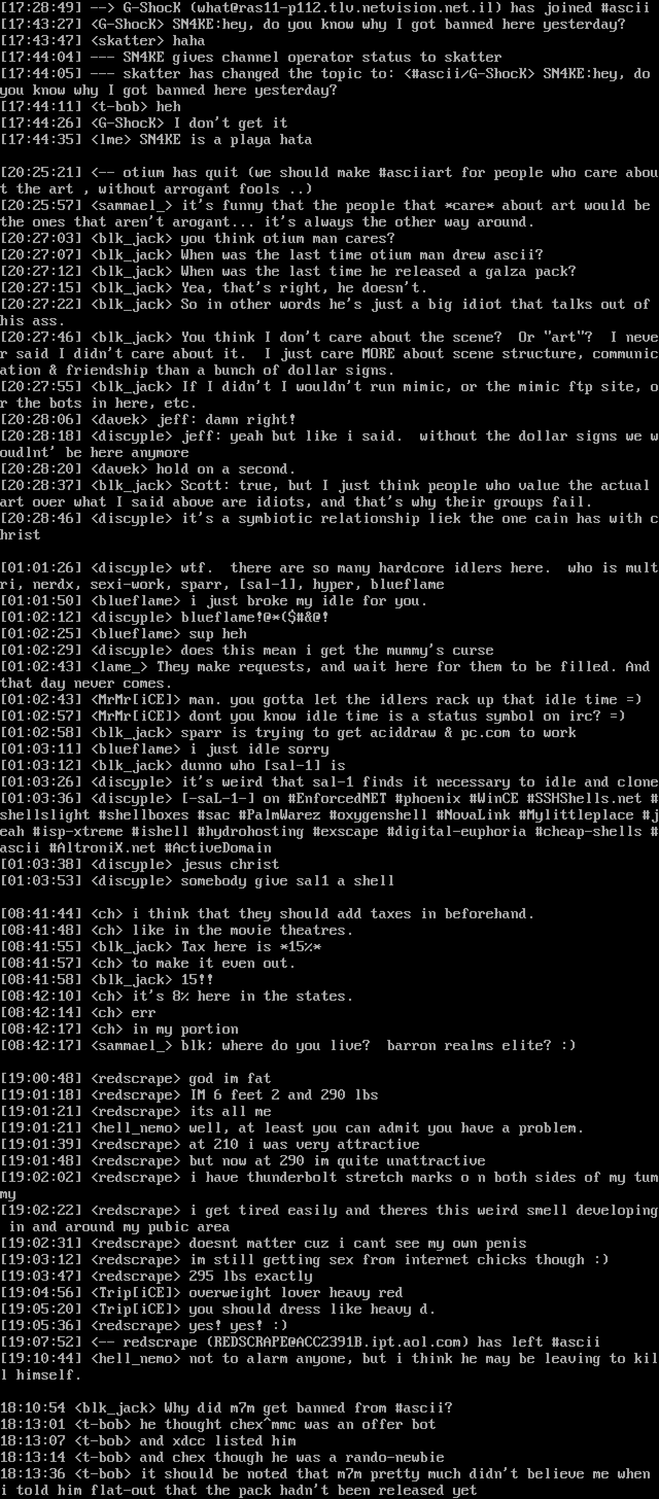 20:25:21 -- otium has quit we should make asciiart for people who care about the art , without arrogant fools ..