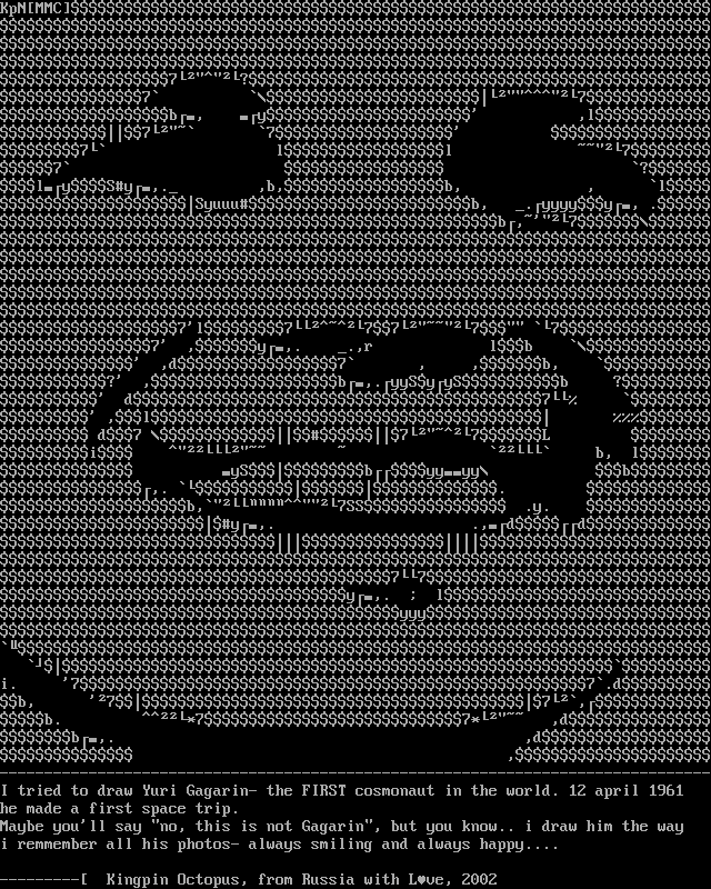 KpNMMC7?7 7b, y ,l7 7 7 ll 77 ?lySy,. ,b,b, , lSyuuub, .yyyyy, .b,77l7777 77 ,y,. .,r lb ,d7 , ,b, ? ,b,.yySyySb ? d7 ,l d7 77L i b, l ySbyyyy b,. . b,7SS .y. y,. .,dd77y,. lyyy i. 77.db, 77,b. *77* ,db,. ,d ,--------------------------------------------------------------------------------I tried to draw Yuri Gagarin- the FIRST cosmonaut in the world. 12 april 1961