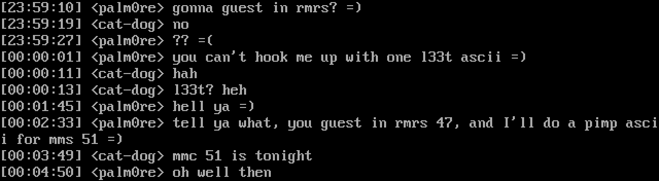 00:00:01 palm0re you cant hook me up with one l33t ascii