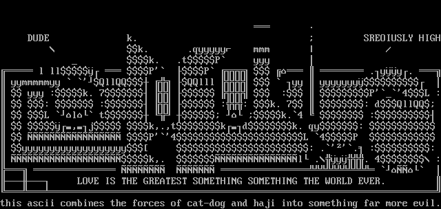 k,. l .y. 4 : LOVE IS THE GREATEST SOMETHING SOMETHING THE WORLD EVER. this ascii combines the forces of cat-dog and haji into something far more evil.