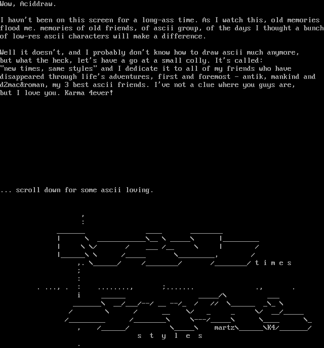 flood me. memories of old friends, of ascii group, of the days I thought a bunchof low-res ascii characters will make a difference.
