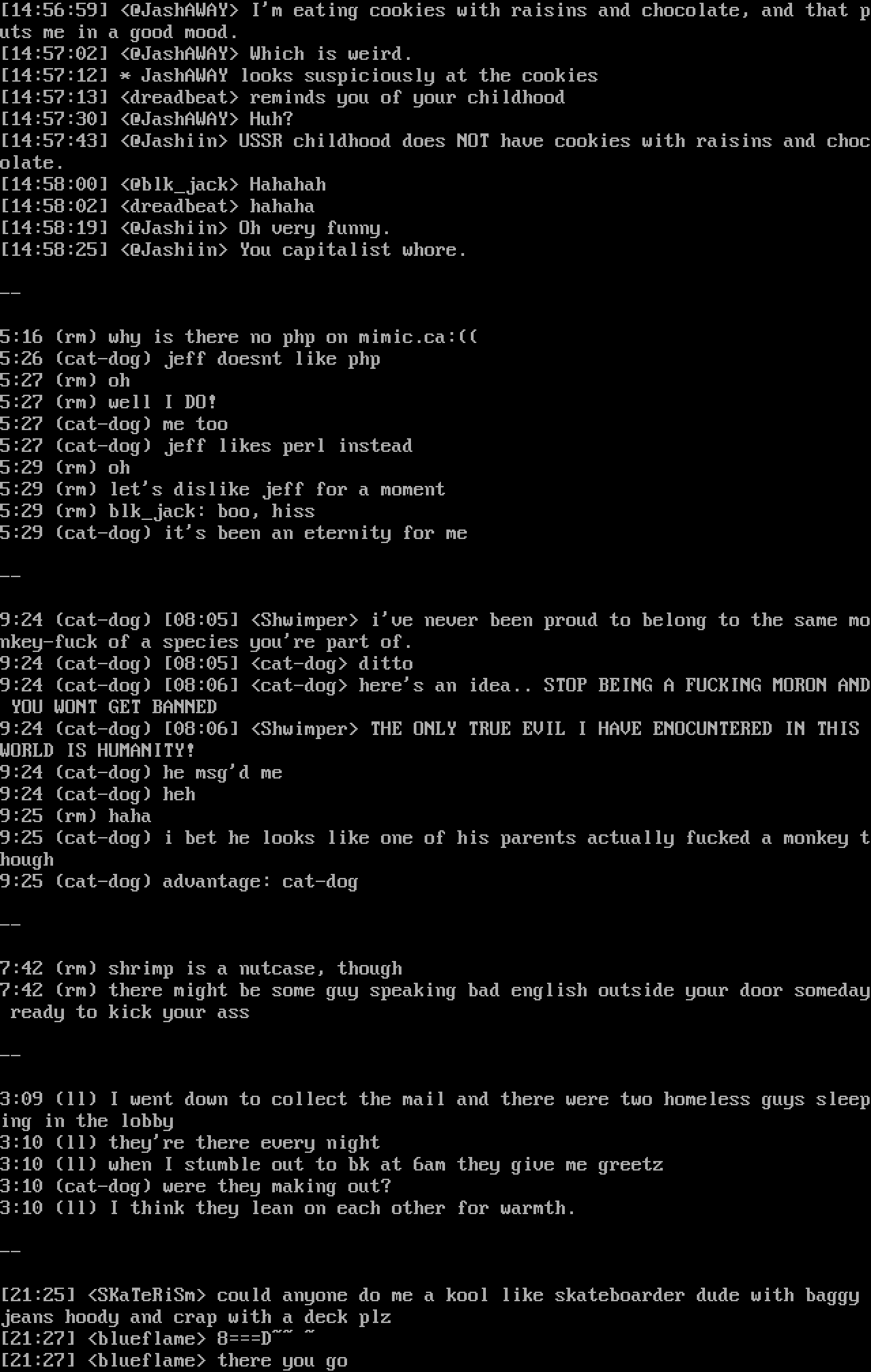 9:24 cat-dog 08:06 cat-dog heres an idea.. STOP BEING A FUCKING MORON AND YOU WONT GET BANNED