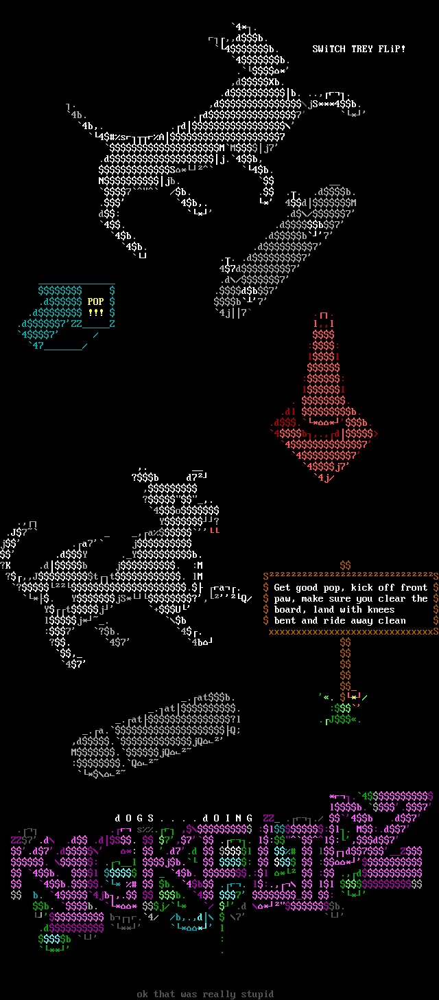 ?,,Jtt. lM SS ?. a. Get good pop, kick off front *. YjS*?,Q/ paw, make sure you clear the Ytj +U board, land with knees lj*. b bent and ride away clean :7 ?b. 4. xxxxxxxxxxxxxxxxxxxxxxxxxxxxxxS ?. 47 4b