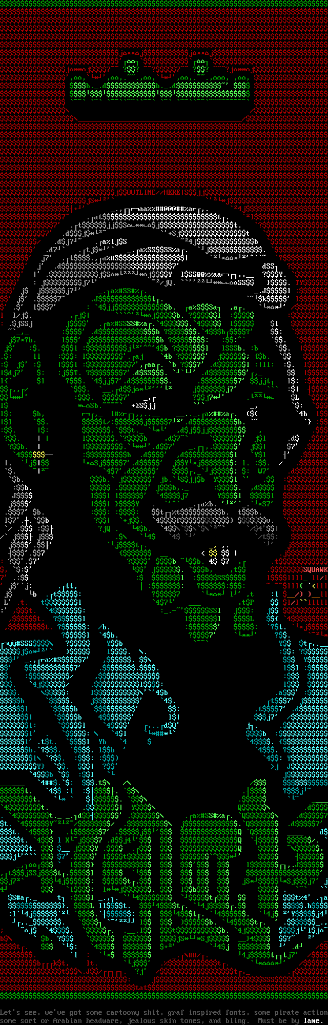 Lets see, weve got some cartoony shit, graf inspired fonts, some pirate actionsome sort or Arabian headware, jealous skin tones, and bling. Must be by lame.