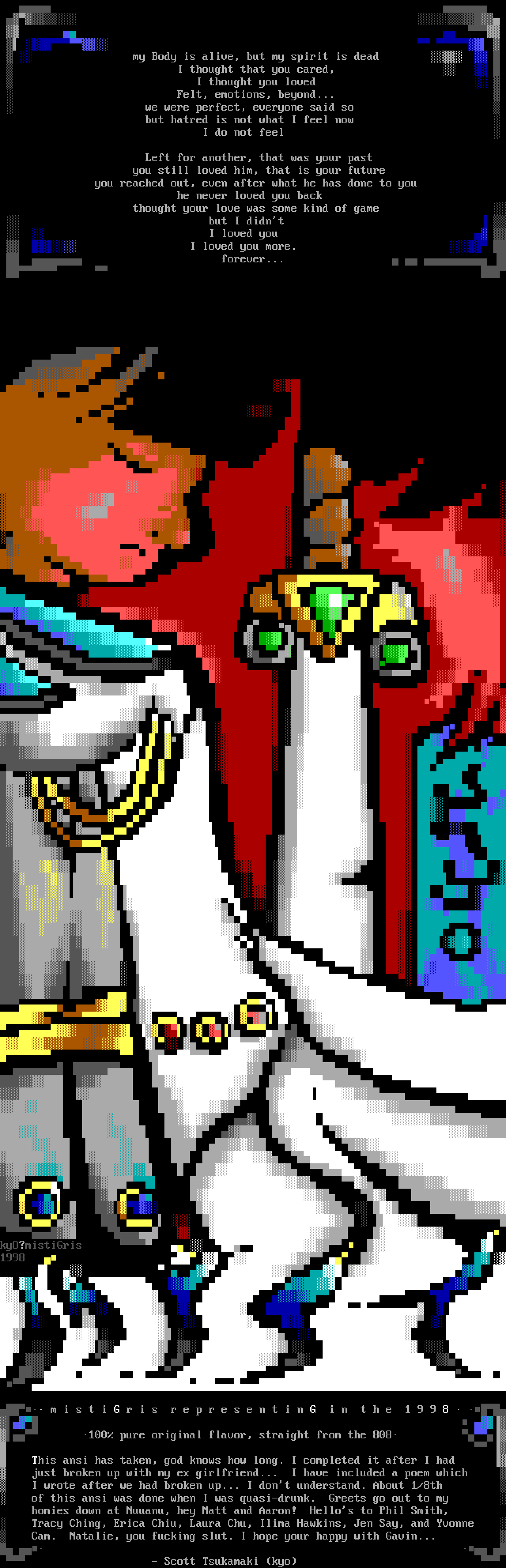 This ansi has taken, god knows how long. I completed it after I had just broken up with my ex girlfriend... I have included a poem which I wrote after we had broken up... I dont understand. About 1/8th of this ansi was done when I was quasi-drunk. Greets go out to my homies down at Nuuanu, hey Matt and Aaron! Hellos to Phil Smith, Tracy Ching, Erica Chiu, Laura Chu, Ilima Hawkins, Jen Say, and Yvonne Cam. Natalie, you fucking slut. I hope your happy with Gavin... - Scott Tsukamaki kyo