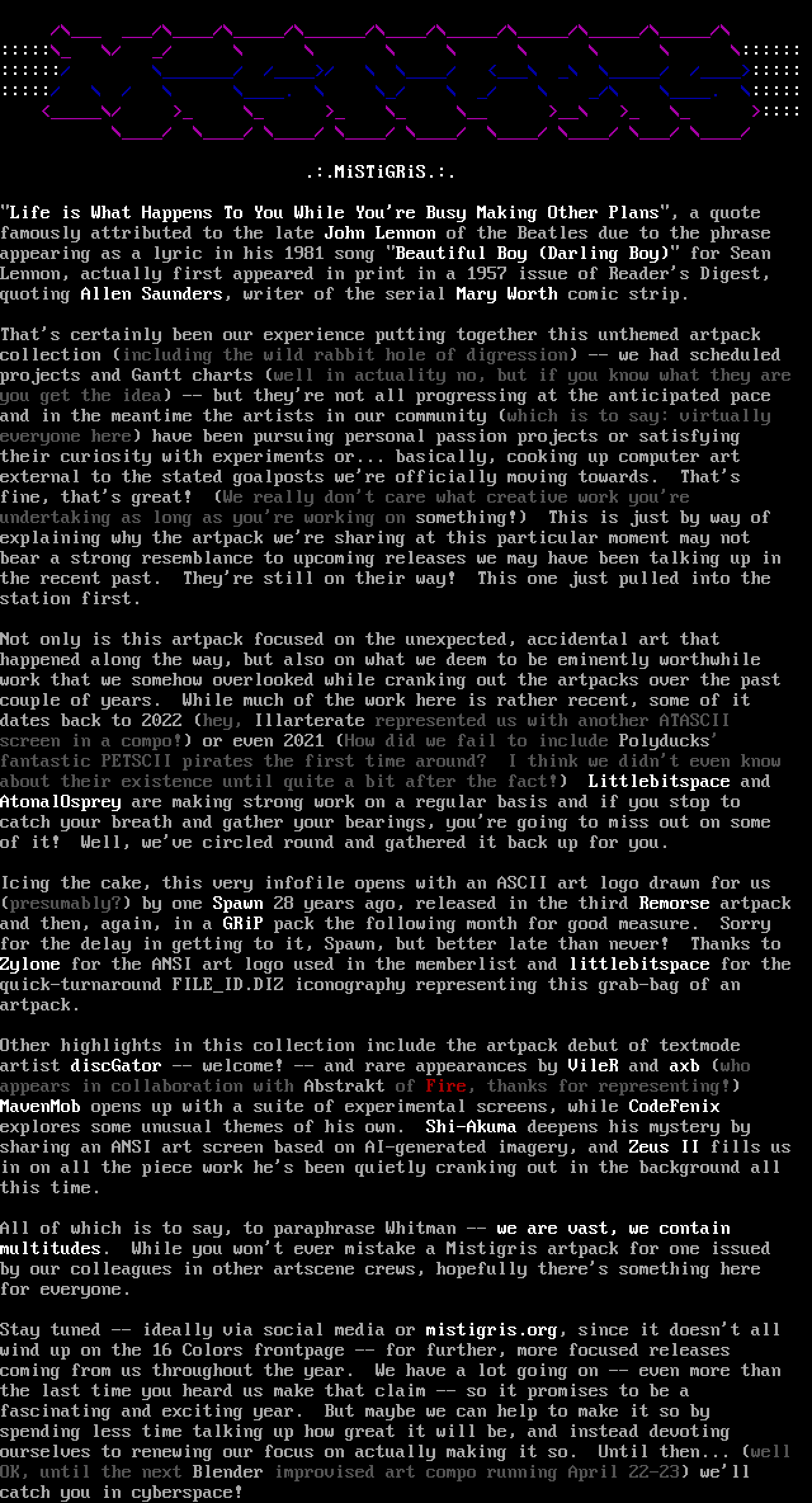 Icing the cake, this very infofile opens with an ASCII art logo drawn for us