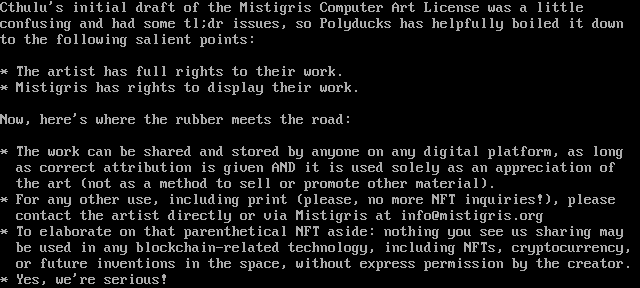 Cthulus initial draft of the Mistigris Computer Art License was a little
