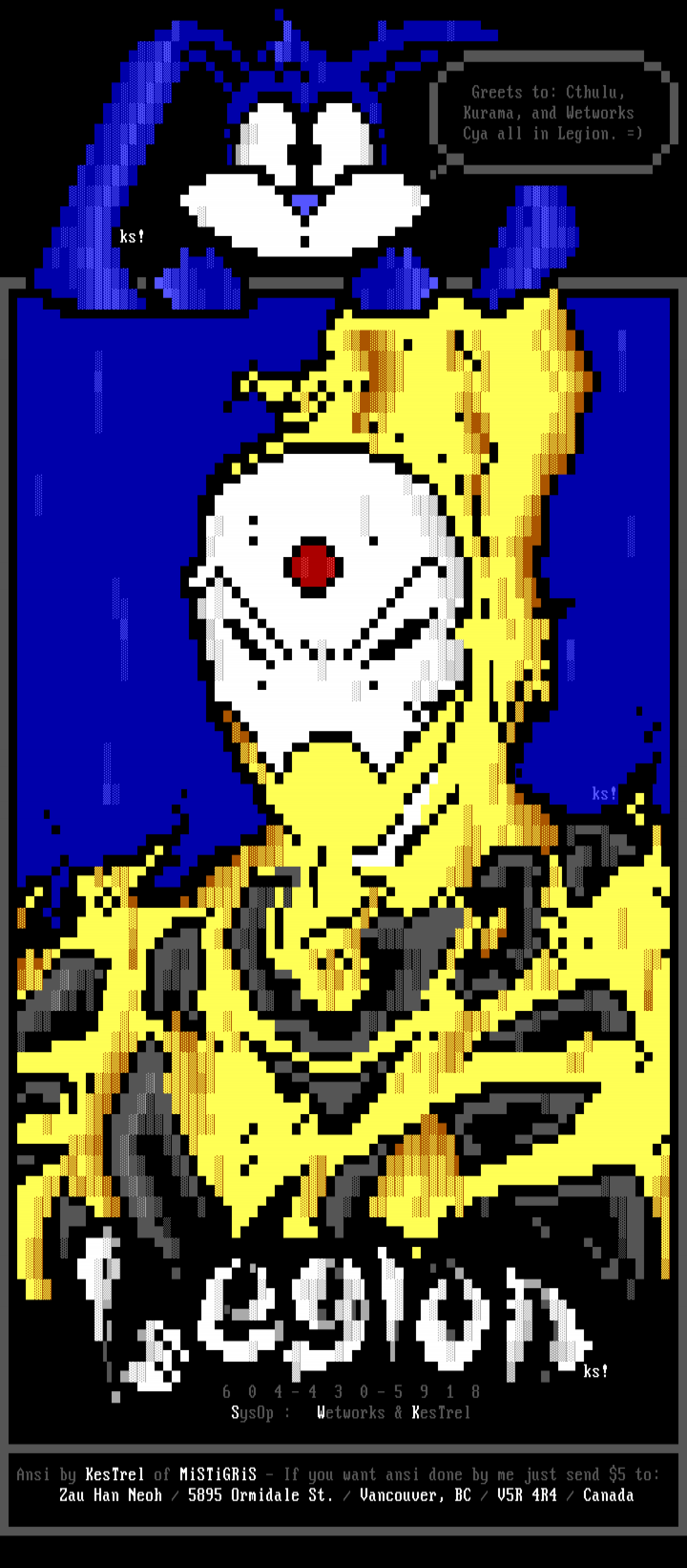 ks! ks! 6 0 4 - 4 3 0 - 5 9 1 8 SysOp : Wetworks KesTrel Ansi by KesTrel of MiSTiGRiS - If you want ansi done by me just send 5 to: Zau Han Neoh / 5895 Ormidale St. / Vancouver, BC / V5R 4R4 / Canada
