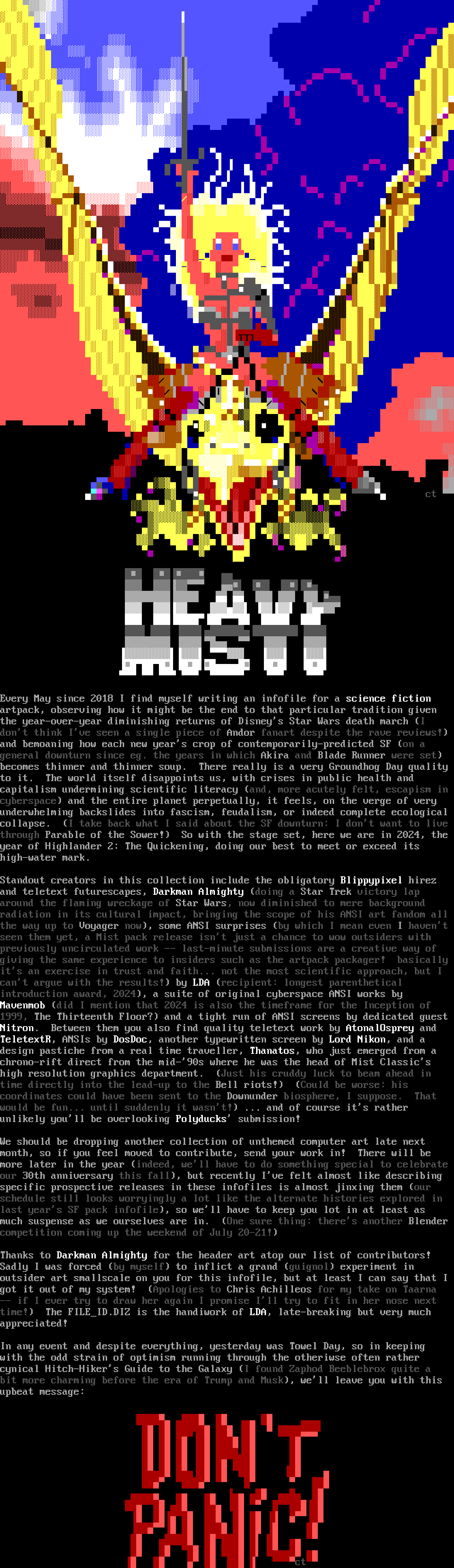 TeletextR, ANSIs by DosDoc, another typewritten screen by Lord Nikon, and a