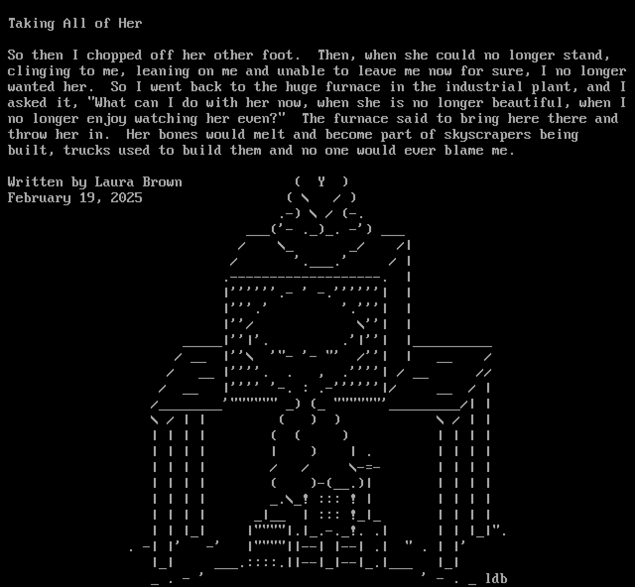 So then I chopped off her other foot. Then, when she could no longer stand,
