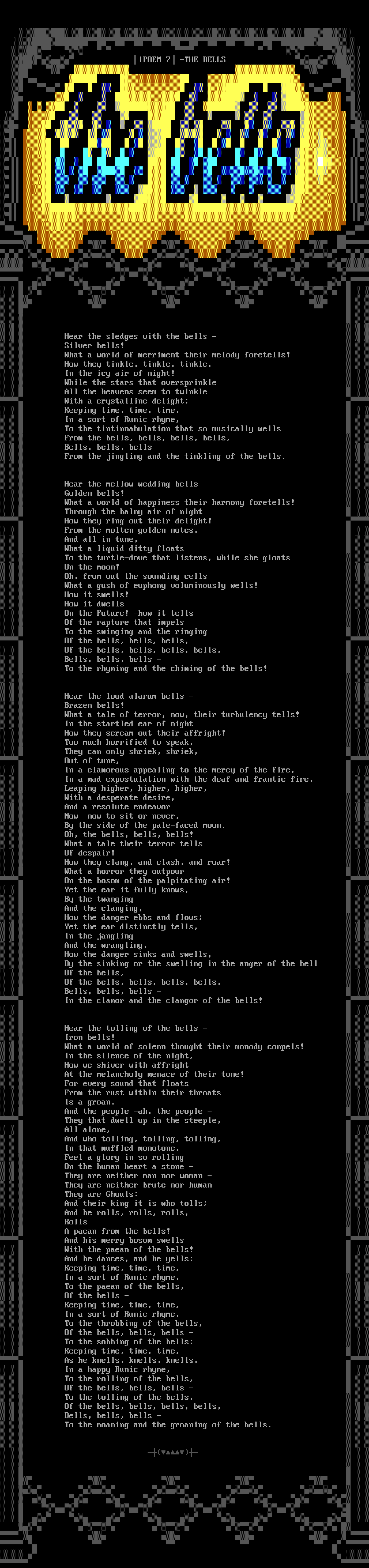 Hear the sledges with the bells - Silver bells! What a world of merriment their melody foretells! How they tinkle, tinkle, tinkle, In the icy air of night! While the stars that oversprinkle All the heavens seem to twinkle With a crystalline delight Keeping time, time, time, In a sort of Runic rhyme, To the tintinnabulation that so musically wells From the bells, bells, bells, bells, Bells, bells, bells - From the jingling and the tinkling of the bells. Hear the mellow wedding bells - Golden bells! What a world of happiness their harmony foretells! Through the balmy air of night How they ring out their delight! From the molten-golden notes, And all in tune, What a liquid ditty floats To the turtle-dove that listens, while she gloats On the moon! Oh, from out the sounding cells What a gush of euphony voluminously wells! How it swells! How it dwells On the Future! -how it tells Of the rapture that impels To the swinging and the ringing Of the bells, bells, bells, Of the bells, bells, bells, bells, Bells, bells, bells - To the rhyming and the chiming of the bells! Hear the loud alarum bells - Brazen bells! What a tale of terror, now, their turbulency tells! In the startled ear of night How they scream out their affright! Too much horrified to speak, They can only shriek, shriek, Out of tune, In a clamorous appealing to the mercy of the fire, In a mad expostulation with the deaf and frantic fire, Leaping higher, higher, higher, With a desperate desire, And a resolute endeavor Now -now to sit or never, By the side of the pale-faced moon. Oh, the bells, bells, bells! What a tale their terror tells Of despair! How they clang, and clash, and roar! What a horror they outpour On the bosom of the palpitating air! Yet the ear it fully knows, By the twanging And the clanging, How the danger ebbs and flows Yet the ear distinctly tells, In the jangling And the wrangling, How the danger sinks and swells, By the sinking or the swelling in the anger of the bell Of the bells, Of the bells, bells, bells, bells, Bells, bells, bells - In the clamor and the clangor of the bells! Hear the tolling of the bells - Iron bells! What a world of solemn thought their monody compels! In the silence of the night, How we shiver with affright At the melancholy menace of their tone! For every sound that floats From the rust within their throats Is a groan. And the people -ah, the people - They that dwell up in the steeple, All alone, And who tolling, tolling, tolling, In that muffled monotone, Feel a glory in so rolling On the human heart a stone - They are neither man nor woman - They are neither brute nor human - They are Ghouls: And their king it is who tolls And he rolls, rolls, rolls, Rolls A paean from the bells! And his merry bosom swells With the paean of the bells! And he dances, and he yells Keeping time, time, time, In a sort of Runic rhyme, To the paean of the bells, Of the bells - Keeping time, time, time, In a sort of Runic rhyme, To the throbbing of the bells, Of the bells, bells, bells - To the sobbing of the bells Keeping time, time, time, As he knells, knells, knells, In a happy Runic rhyme, To the rolling of the bells, Of the bells, bells, bells - To the tolling of the bells, Of the bells, bells, bells, bells, Bells, bells, bells - To the moaning and the groaning of the bells. --