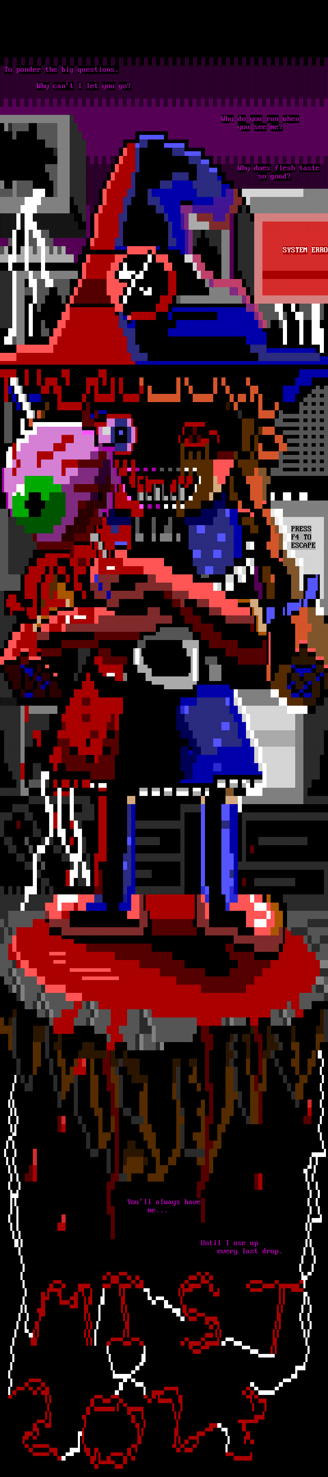 Toponderthebigquestions.WhycantIletyougo?Whydoyourunwhenyouseeme? Whydoesfleshtastesogood? SYSTEMERRO 7 PRESS F4 TO ESCAPE