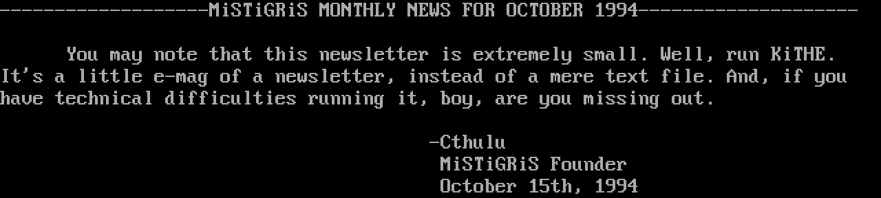 -------------------MiSTiGRiS MONTHLY NEWS FOR OCTOBER 1994--------------------