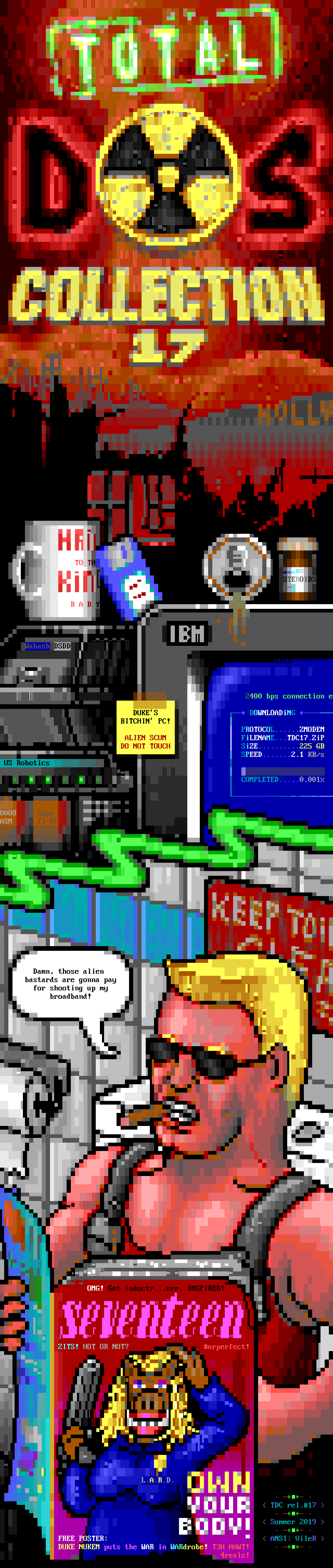 2400 bps connection e DUKES DOWNLOADiNG BITCHIN PC! PROTOCOL......ZMODEM ALIEN SCUM FiLENAME...TDC17.ZiP DO NOT TOUCHSiZE..........225 GB SPEED.......2.1 KB/s US Robotics COMPLETED.....0.001 8088 Copy ASM II-PC Damn, those alien bastards are gonna pay for shooting up my broadband! ... , OMG! Get indoctr...err, INSPIRED!