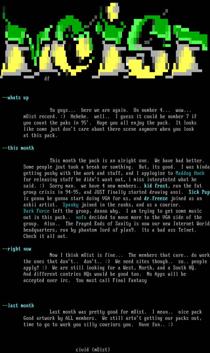 group crisis in 94-95, and JUST finally started drawing ansi. Sick Pup is gonna be gonna start doing VGA for us, and dr.freeze joined as an