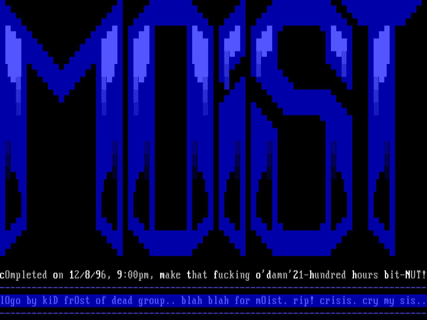 cOmpleted on 12/8/96, 9:00pm, make that fucking odamn21-hundred hours bit-NUT!--------------------------------------------------------------------------------lOgo by kiD frOst of dead group.. blah blah for mOist. rip! crisis. cry my sis..--------------------------------------------------------------------------------