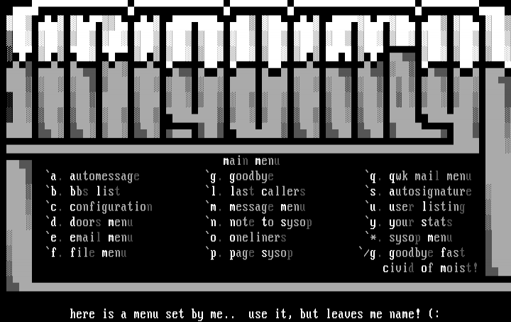 main menu a. automessage g. goodbye q. qwk mail menu b. bbs list l. last callers s. autosignature c. configuration m. message menu u. user listing d. doors menu n. note to sysop y. your stats e. email menu o. oneliners *. sysop menu f. file menu p. page sysop /g. goodbye fast civid of moist!