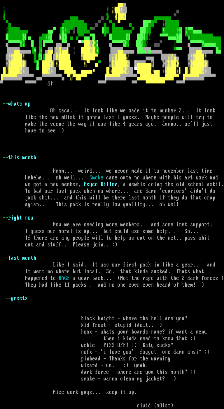 we got a new member, Psyco Killer, a newbie doing the old school askii. To bad our last pack when no where... are damn couriors didnt do