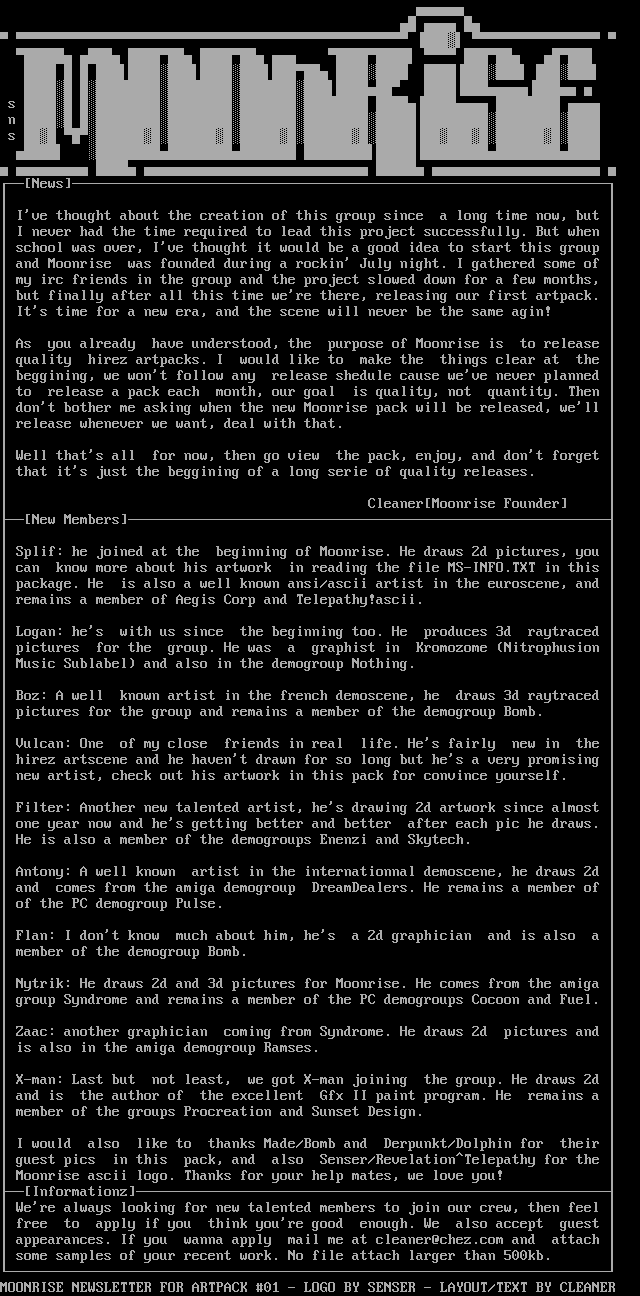 MOONRISE NEWSLETTER FOR ARTPACK 01 - LOGO BY SENSER - LAYOUT/TEXT BY CLEANER