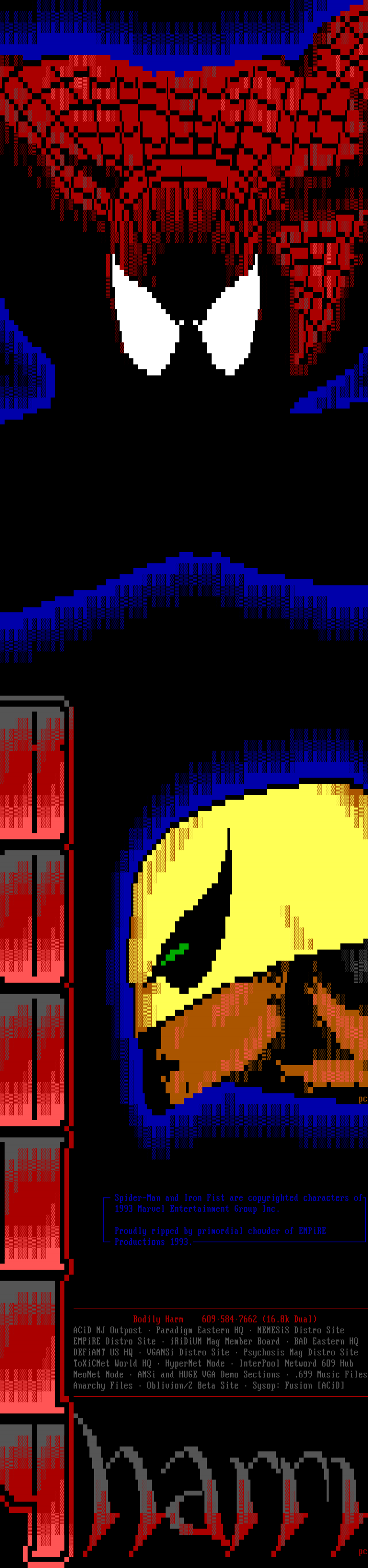 Spider-Man and Iron Fist are copyrighted characters of 1993 Marvel Entertainment Group Inc. Proudly ripped by primordial chowder of EMPiRE Productions 1993.